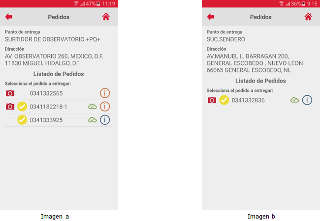 En la pantalla Pedidos se mostrará el pedido pre-rendido identificado con un checkmark color amarillo para indicar que el tipo de pre-rendición es Entrega Parcial, esto en el caso en que haya tomado al menos una fotografía, así como un icono de nube color verde indicando que la evidencia se envió con éxito (Imagen a). Si el chofer o transportista omitió la toma de fotografías se mostrará un icono “Cámara” en color rojo y un icono de nube en color rojo adicional al checkmark color amarillo (Imagen b).