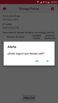 •        Si el chofer o transportista no desea finalizar con la entrega parcial, deberá presionar el botón [No] y dicha acción mostrará la pantalla Entrega Parcial donde continúa viéndose los números de parte con su cantidad devuelta registrada.