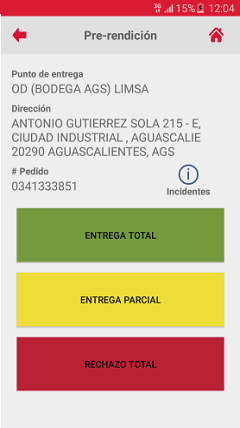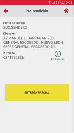 •        Si el chofer o transportista tiene habilitada la pre-rendición entrega parcial por detalle, entonces se mostrará la pantalla Entrega Parcial.