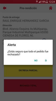 El chofer o transportista deberá presionar el botón [Rechazo Total] y esta acción mostrará el siguiente mensaje: ¿Estás seguro que todo el pedido fue rechazado?