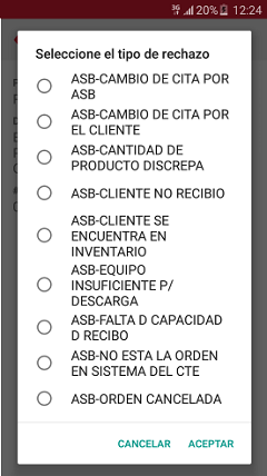 El chofer o transportista deberá seleccionar un tipo de rechazo.