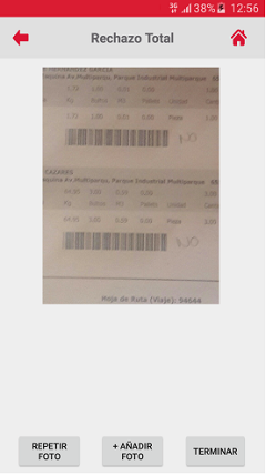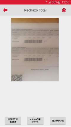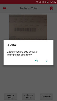 - Si el chofer o transportista no desea terminar de capturar fotografías, deberá presionar el botón [No] y esta acción mostrará la pantalla Rechazo Total donde se visualiza la última fotografía capturada como prueba de rechazo.