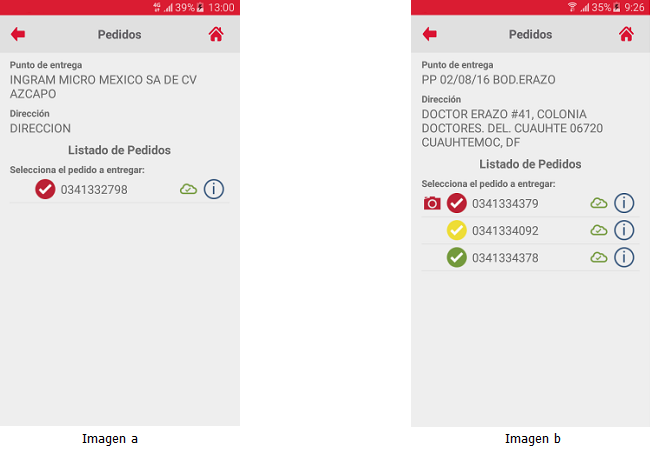 En la pantalla Pedidos se mostrará el pedido pre-rendido identificado con un checkmark color rojo para indicar que el tipo de pre-rendición es Rechazo Total, esto en el caso en que haya tomado al menos una fotografía así como un icono de nube color verde indicando que la evidencia se envió con éxito (Imagen a). Si el chofer o transportista omitió la toma de fotografías se mostrará un icono “Cámara” en color rojo y un icono de nube en color rojo adicional al checkmark color rojo (Imagen b).