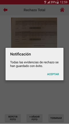 El chofer o transportista podrá capturar, repetir o añadir la(s) fotografía(s) correspondientes como prueba de rechazo de un pedido, o sólo finalizar con la toma de fotografías. El chofer o transportista tras haber terminado de capturar la(s) fotografía(s) como prueba de rechazo, deberá presionar el botón [Terminar] y esta acción mostrará el siguiente mensaje: