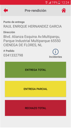 - Si el chofer o transportista no está seguro del tipo de rechazo que seleccionó, deberá presionar el botón [Cancelar] y esta acción mostrará la pantalla Pre-Rendición.