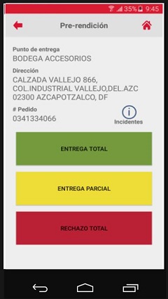 - De lo contrario mostrará la pantalla según el flujo que se haya seguido, si accedió a los Incidentes del pedido desde la pantalla de pre-rendición entonces regresará a dicha pantalla.