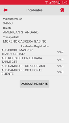 - El chófer o transportistas podrá cancelar para que no se guarden los incidentes, la aplicación validará si el viaje ya tiene incidentes registrados, si se cumple la validación la aplicación mostrara la pantalla de "Incidentes".