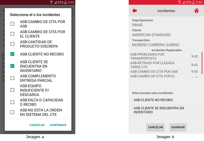 El chofer o transportista selecciona el o los incidentes de su interés (Imagen a) y posteriormente deberá presionar el botón [Confirmar], se mostrará la pantalla Incidentes con los incidentes seleccionados previamente (Imagen b):