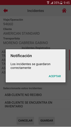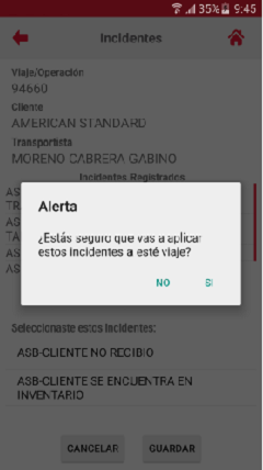 - Si el chofer o transportista desea no asignar los incidentes seleccionados, deberá presionar el botón [No], ésta acción mostrará la pantalla Incidentes con el listado de incidentes ya seleccionados previamente.
