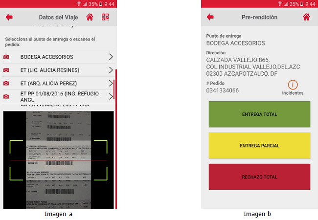 El chofer o transportista deberá escanear un código de barras de un pedido de su interés (Imagen a) y ésta acción mostrará la pantalla Pre-Rendición siempre y cuando el pedido no tenga un estatus de pre-rendido (Imagen b):