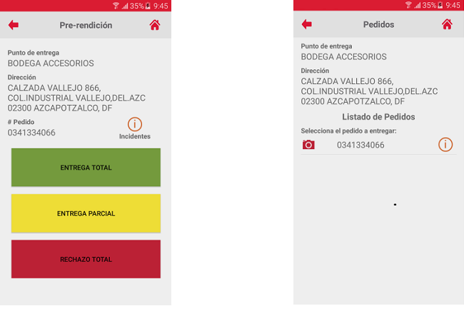 El chofer o transportista deberá presionar el botón [Aceptar] y ésta acción mostrará la pantalla Pedidos, donde se visualiza el botón [I Incidentes] del pedido seleccionado en color naranja: