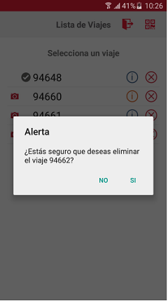 •        Si el chofer o transportista no desea eliminar el viaje, deberá presionar el botón [No] y esta acción mostrará la pantalla Listado de Viajes donde se continúa visualizando el viaje seleccionado: