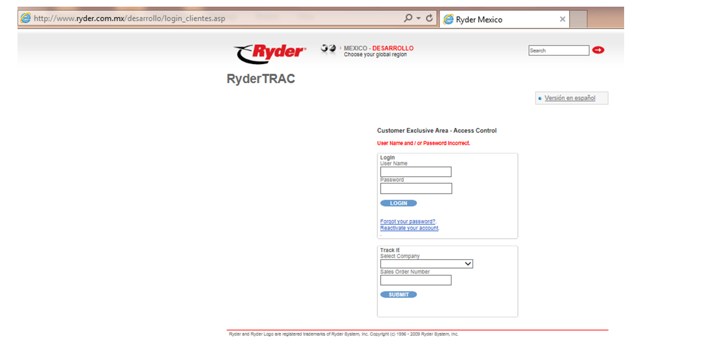 Una vez posicionado en la ventana del sistema Ryder Trac, el usuario deberá capturar los datos de autenticación y dar clic en el botón [Login] o [Ingresar], el nombre de los botones depende del idioma en que se esté consultando, esta acción validará que los datos de autenticación sean correctos, y si alguno de los datos es incorrecto, se mostrará el siguiente mensaje: