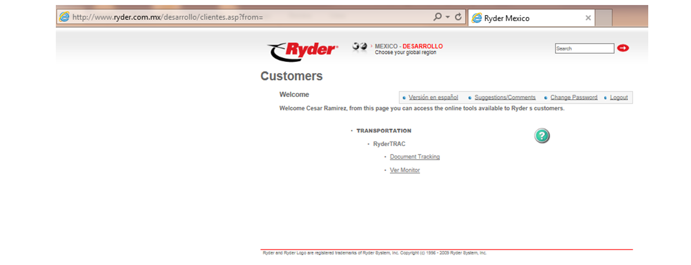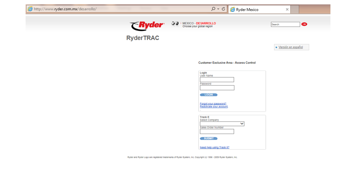 El usuario deberá ingresar a la URL correspondiente al sistema Ryder Trac y dicha acción mostrará la siguiente ventana: