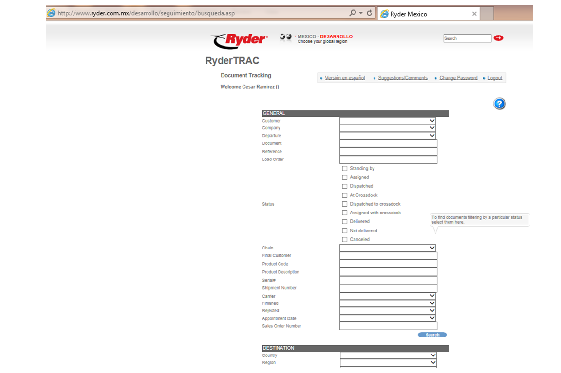 El usuario deberá dar clic en la opción Document Tracking y esta acción mostrará la siguiente ventana: