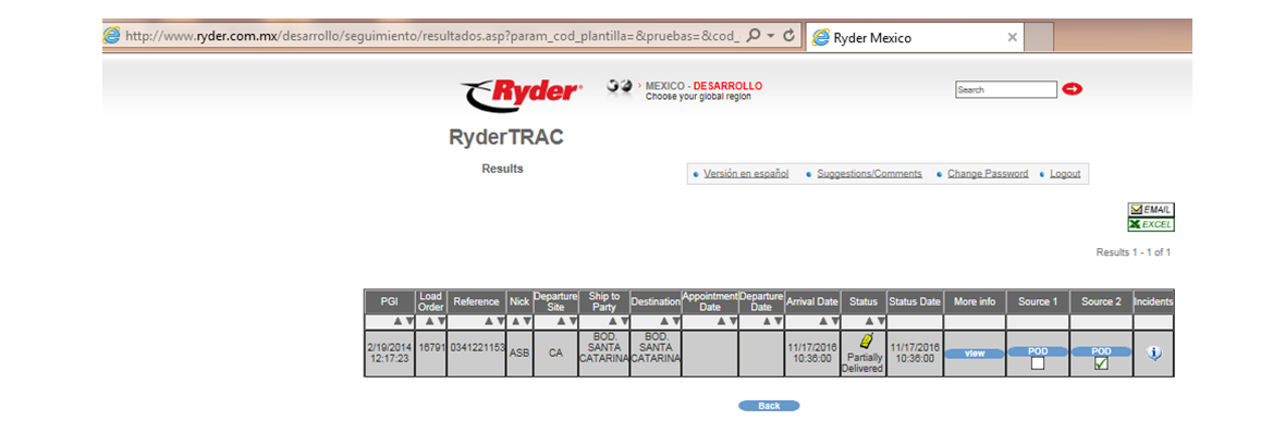 El usuario deberá capturar los datos correspondientes para realizar la búsqueda del pedido de su interés y posteriormente deberá presionar el botón [Search] o [Buscar], esta acción mostrará la siguiente ventana: