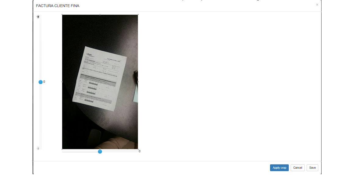 Una vez que el usuario tiene indicada el área que desea conservar, deberá dar clic en el botón [Apply crop] o [Aplicar corte] (el nombre del botón depende del idioma) y se mostrará la misma ventana con la imagen recortada así como los valores de brillo y rotación inicializados.