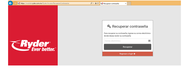 El usuario está posicionado en la ventana Inicio de Sesión, deberá seleccionar el checkbox “Recuperar contraseña” y esta acción muestra la siguiente ventana: