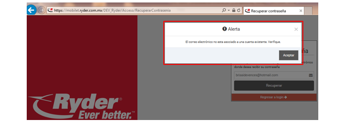 El usuario deberá capturar el correo electrónico con el que tiene relacionada la cuenta de usuario y posteriormente deberá dar clic en el botón [Recuperar], dicha acción valida si el correo electrónico está asociado a una cuenta y al no estarlo se muestra la siguiente alerta: