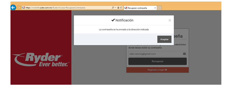 Si el correo electrónico está asociado con una cuenta de usuario existente se envía por email una nueva contraseña temporal y se muestra la siguiente notificación: