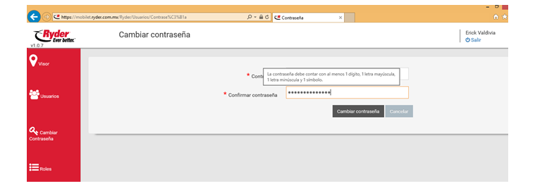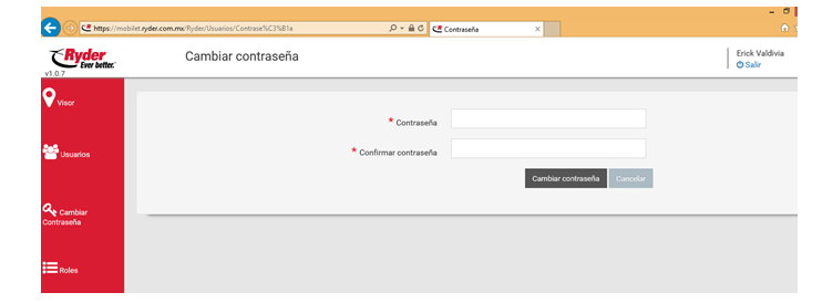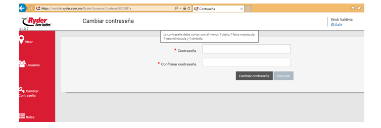 O el usuario deberá dar clic en el botón [cancelar] y esta acción muestra la ventana Cambiar Contraseña con los datos capturados aún vigentes en las cajas de texto o vacíos, según sea el caso.