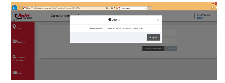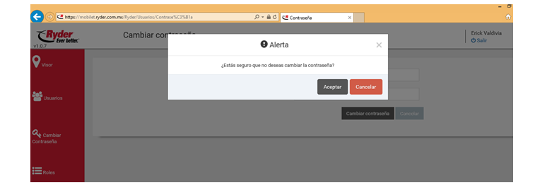 Si el usuario no está seguro del cambio de contraseña puede cancelar la acción haciendo clic el botón [Cancelar] y se muestra la siguiente alerta: